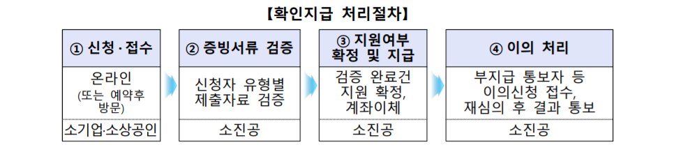 증빙서류를 온라인으로 제출 후 소상공인시장진흥공단에서 확인 · 검증을 거쳐 지급