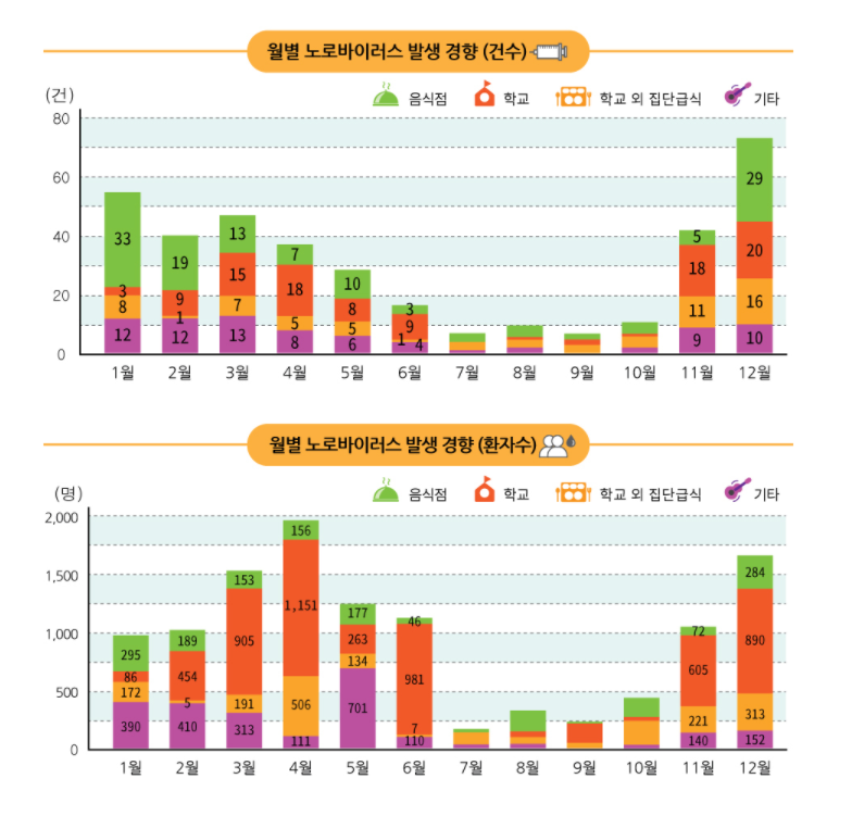 원인이 밝혀진 식중독은 노로바이러스에 의한 감염이 가장 많다. 다른 식중독과는 달리 노로바이러스는 말그대로 '바이러스'로 인한 것이라서 음식이 상하지 않더라도 식중독을 일으킨다. 음식의 신선도 문제와는 별개이기 때문에 여름에 발병률이 높고 겨울로 가면서 차츰 발병률이 떨어지는 세균성 식중독과는 달리 겨울철에도 발병이 되며 오히려 낮은 온도에서 활동량이 많아지고 영하 20도의 낮은 온도에서도 활동하는 노로바이러스의 특성상 겨울철에 발생 빈도가 높다.