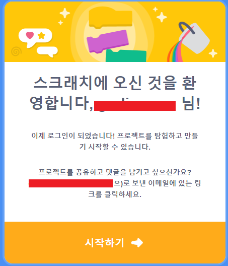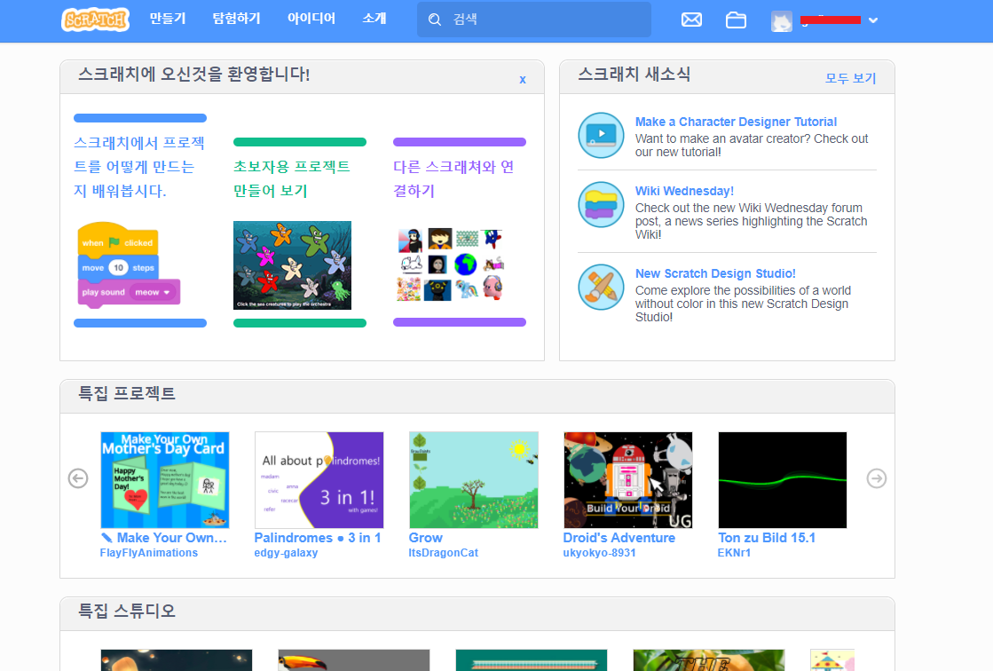 이렇게 하다보면 아래 화면을 만날 수 있습니다. 스크래치에 가입하고 로그인까지 된 겁니다.