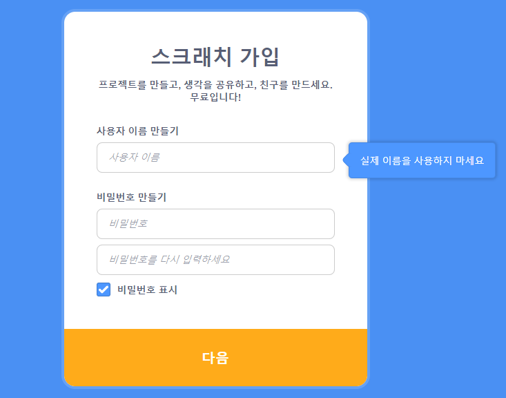 오른쪽 상단에 스크래치 가입을 클릭하면 아래 이미지가 나오고 입력란에 정보를 입력하기만 하면 됩니다. 그리고 다음, 다음 화면에서 정보를 입력하고 다음, 또 다음 화면 다음...