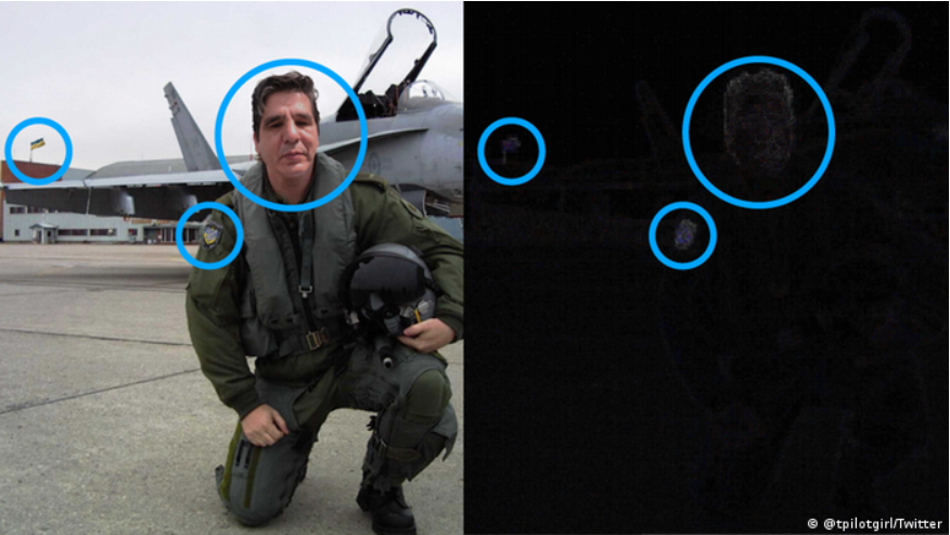 일부 사진은 분명히 진본이 아니다. 다음 이미지가 변경되었다는 사실은 예를 들어 이미지 처리 프로그램을 사용한 노이즈 분석에 의해 표시될 수 있다. 이미지가 변경되면 노이즈에 가시적인 흔적이 남는다. 이 특정한 경우에 이것은 조종사의 머리, 팔에 있는 휘장, 배경에 있는 우크라이나 국기에서 볼 수 있다.