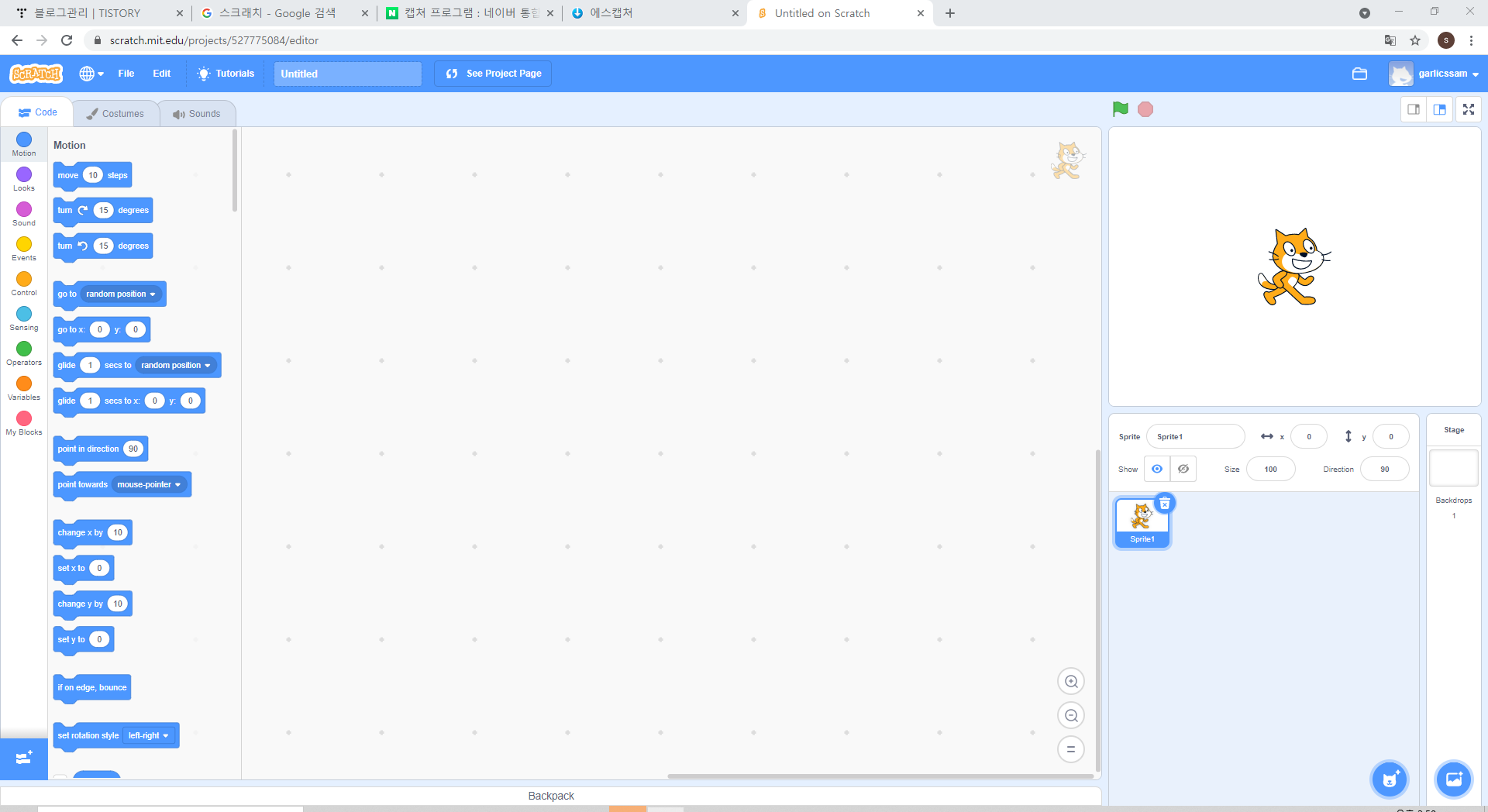 여기가 스크래치로 무언가를 만들 때 작업하는 곳입니다.