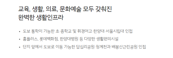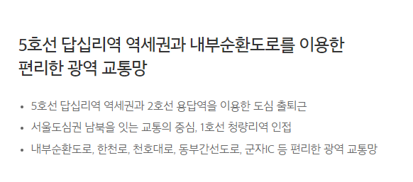 5호선 답십리역, 2호선 용답역이 있어 시내진출이 용이하고 내부순환도로, 성수JC, 천호대로, 동부간선도로, 군자IC 등 도로망도 갖췄다.
