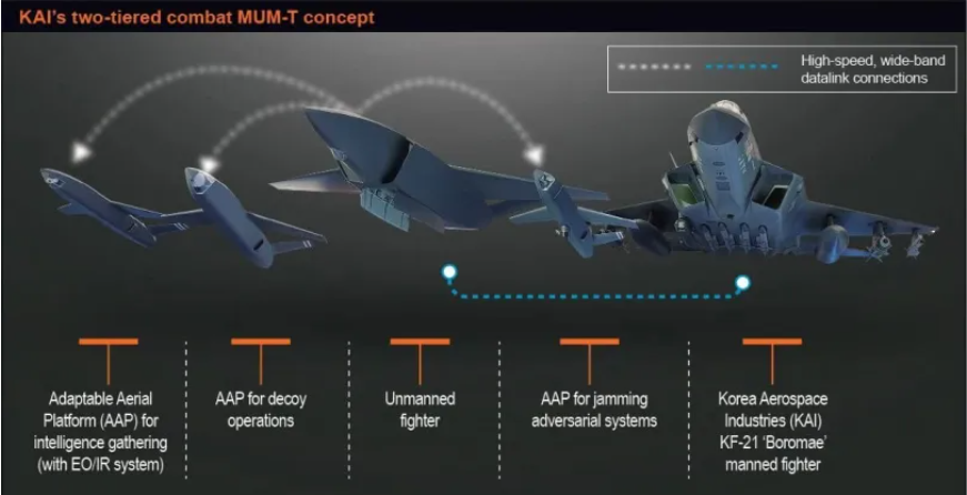 이미지에는 KF-21이 이끄는 윙맨과 드론이 모두 등장하는 KAI의 '2단 전투 MUM-T 컨셉트'라는 제목이 붙었다. 대표적인 무인 전투기가 보라매와 연계된 모습이 그려져 있다. 이 드론 자체는 접이식 문이 있는 내부 베이 내부로 운반할 수 있는 것으로 보이는 다른 소형 드론 3개와 네트워크로 연결되어 있다.