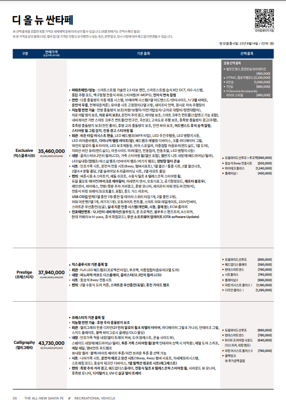 2.5T 익스클루시브의 가격은 3,543만원, 프레스티지의 가격은 3,794만원, 캘리그래피는 4,373만원, 1.6T 하이브리드의 경우 익스클루시브의 가격은 4,031만원(3,888만원), 프레스티지는 4,279만원(4,136만원), 캘리그래피는 4,764만원(4,621만원)이다.