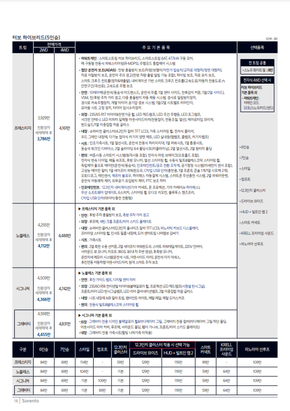 2.5T의 가격은 3,506만원~4,193만원, 2.2L 디젤은 3,679만원~4,366만원, 1.6T 하이브리드 2WD는 3,786만원~4,455만원, 4WD는 4,161만원~4,831만원에서 시작된다.