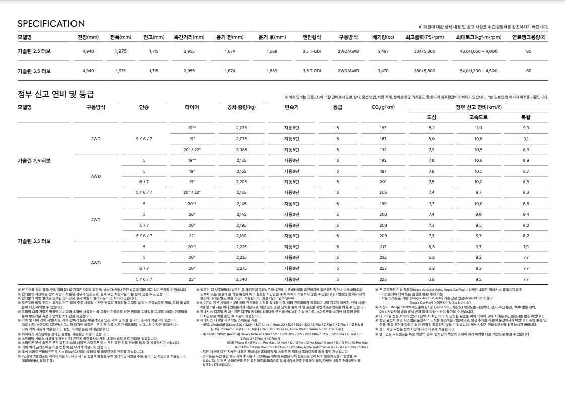 | 연비 | 복합 8~11.7km/ℓ (도심 7.1~10.4, 고속 9.3~13.7) |