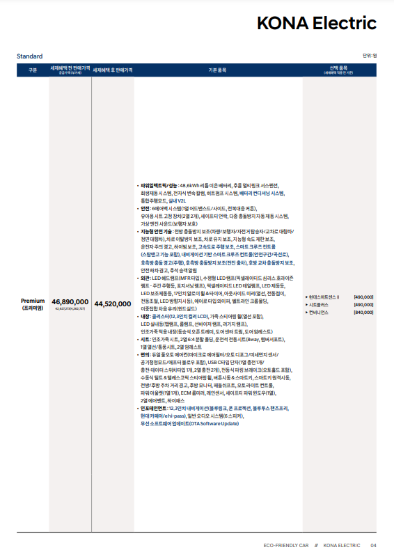 | 연비 | 복합 4.8~5.5km/kWh (도심 5.2~6.1, 고속 4.4~5) |