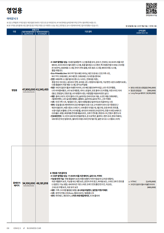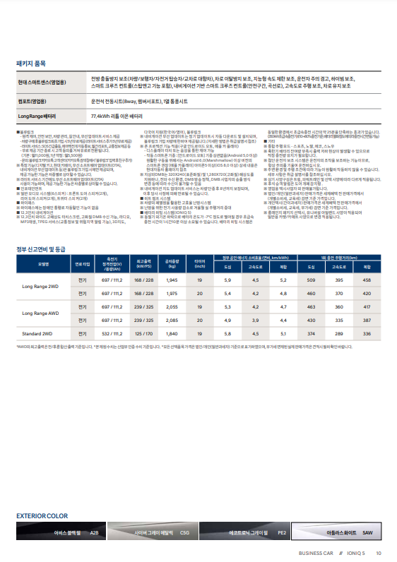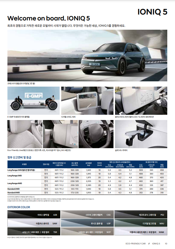 | 연비 | 복합 4.7~5.2km/kWh (도심 5.3~5.9, 고속 4.2~4.5) |
