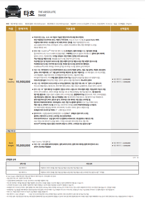 유럽 기준을 따르는 대한민국 디젤 배기가스 인증방식에 따라 3.0L 디젤 엔진은 들어오지 않고, 426마력 V8 6.2L OHV 자연흡기 가솔린 엔진이 탑재된다.