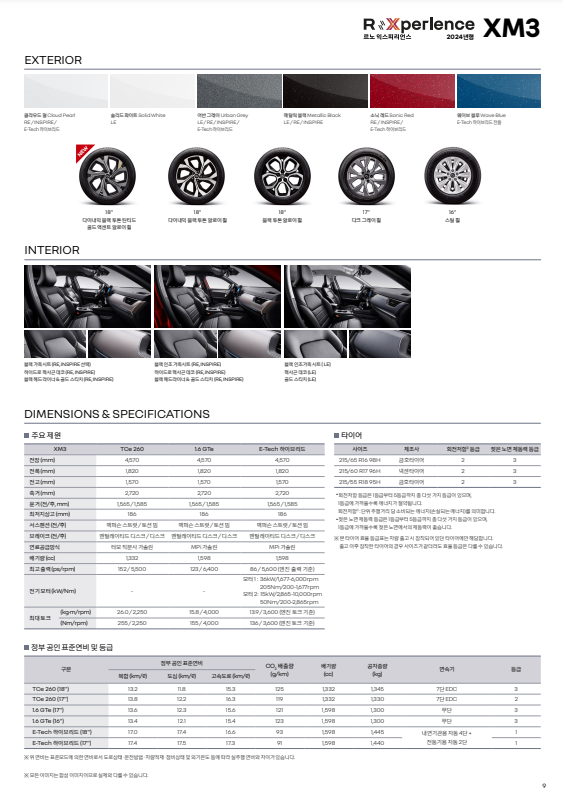 르노 XM3 연료 가솔린 연비 복합 13.2~13.8km/ℓ 출력 123~152hp 토크 15.8~26kg.m 배기량 1,332~1,598cc 변속 CVT, DCT7단 전장 4,570mm 전고 1,570mm 전폭 1,820mm 축거 2,720mm 르노코리아의 소형 쿠페형 SUV. 르노삼성자