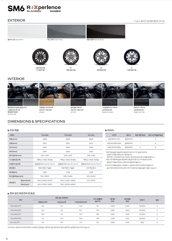 르노코리아 QM6 연료 LPG, 가솔린 연비 복합 8.6~12km/ℓ (도심 7.7~11.1, 고속 9.9~13.5) 출력 140~144hp 토크 19.7~20.4kg.m 배기량 1,997~1,998cc 변속 CVT 전장 4,675mm 전고 1,700~1,710mm 전폭 1,845mm 축거 2,705mm 르노코리
