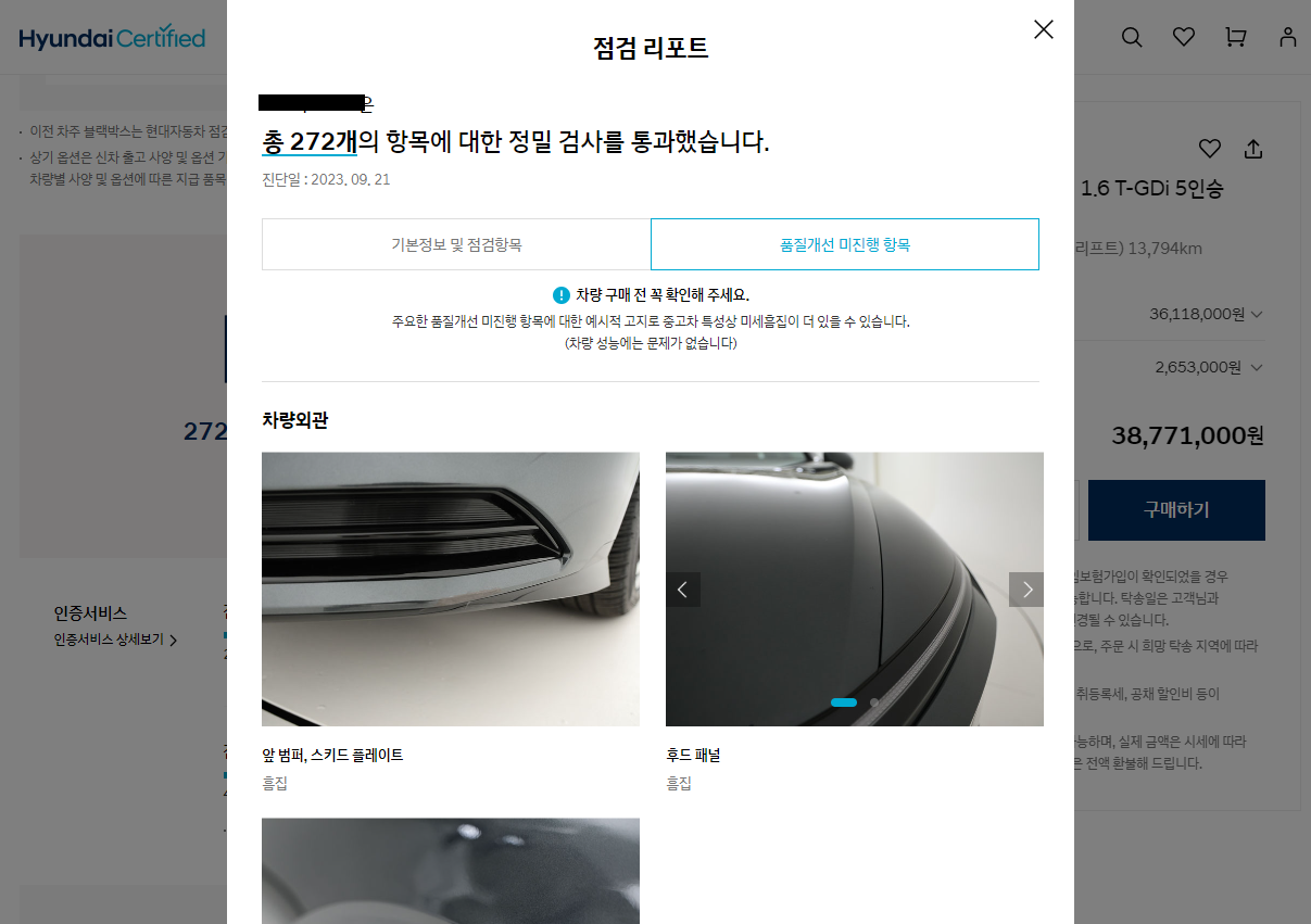 점검리포트 팝업에서는 굉장히 상세한 내용을 이미지로 제공하고 있습니다. 품질개선 미진행 항목에서는 미세한 흠집까지 고화질 이미지로 확인할 수 있는데 직접 차량을 눈으로 보면서 확인하지 않으면 찾을 수 없는 부분까지 솔직하게 올려놓고 있습니다. 대기업이 중고차시장에 참여한 장점 중 하나가 여기서 확인되고 있습니다.