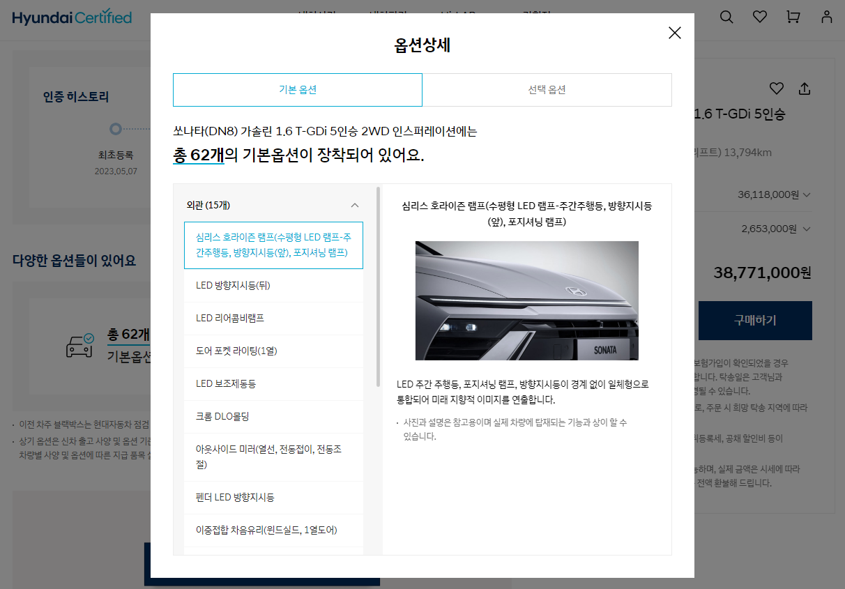 인증 히스토리에서는 신차출고일과 현대자동차의 매입일, 성능점검일, 인증일이 표출됩니다. 아래의 옵션확인 부분에서 더 보기를 클릭하면 옵션의 상세내용을 확인할 수 있습니다.