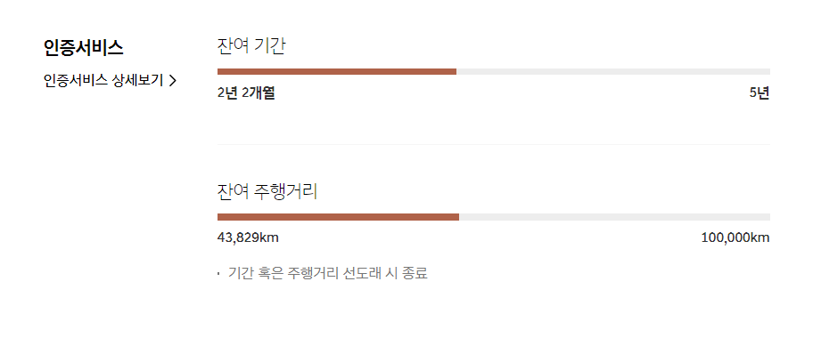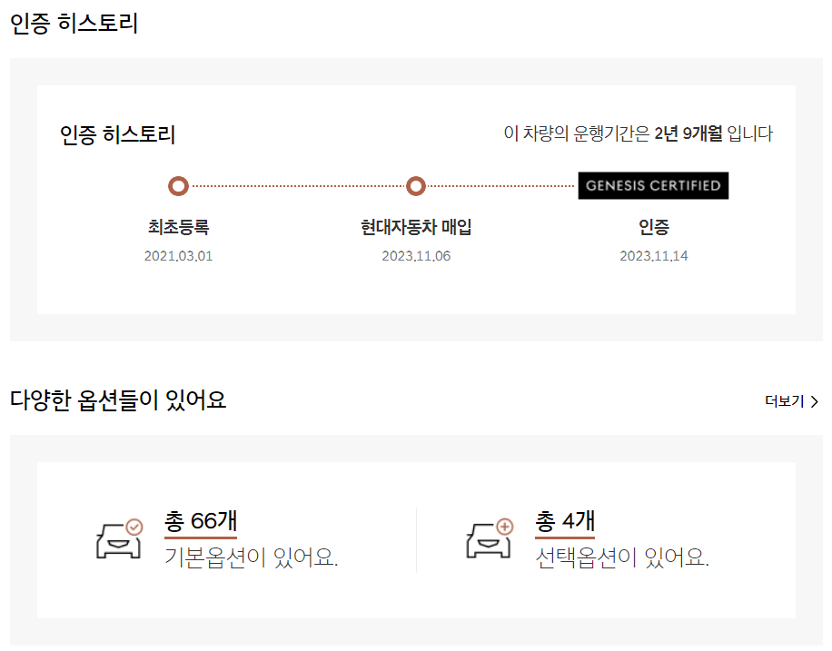 인증 히스토리에서는 신차출고일과 현대자동차의 매입일, 성능점검일, 인증일이 표출됩니다. 아래의 옵션확인 부분에서 더 보기를 클릭하면 옵션의 상세내용을 확인할 수 있습니다.