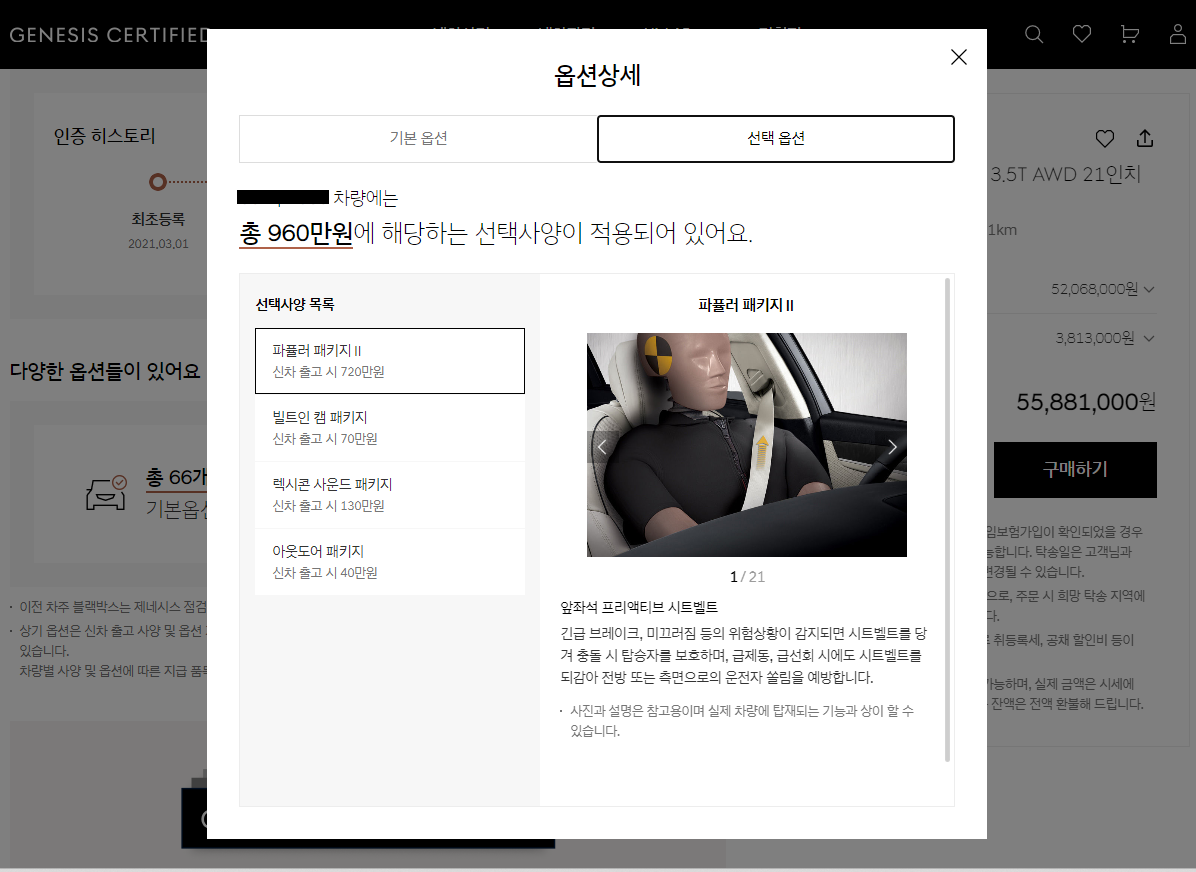 기본옵션과 선택옵션에 대해 상세하게 확인할 수 있습니다. 선택사양 목록에서는 신차 출고 시 해당 옵션의 가격까지 나옵니다.