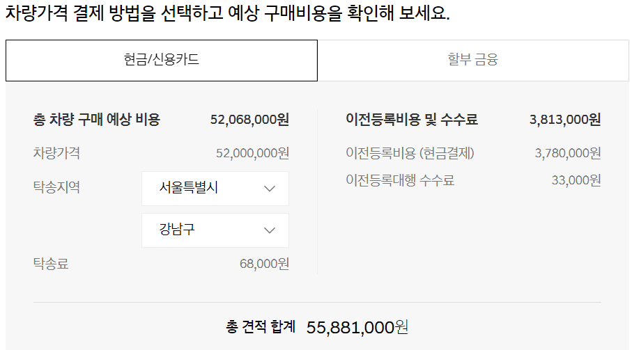 구매 예상 비용과 이전등록비 및 수수료 등을 합한 총 견적 합계를 보여줍니다. 이 차량은 총 견적 합계가 55,881,000원으로 나타납니다.