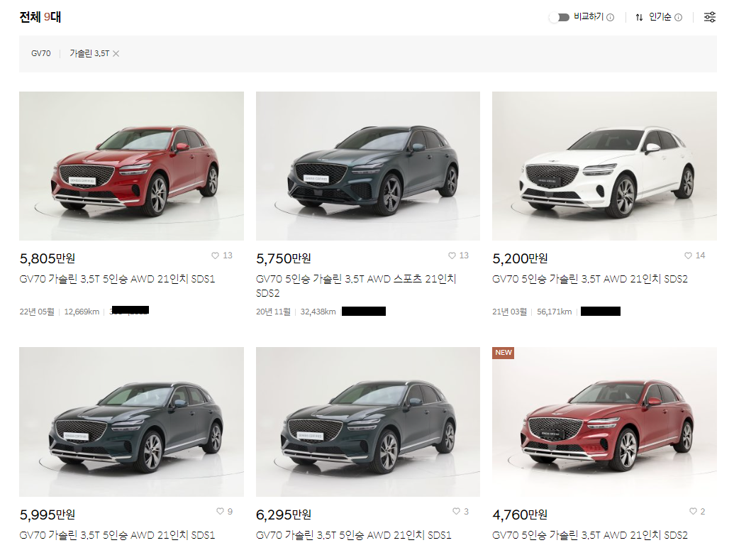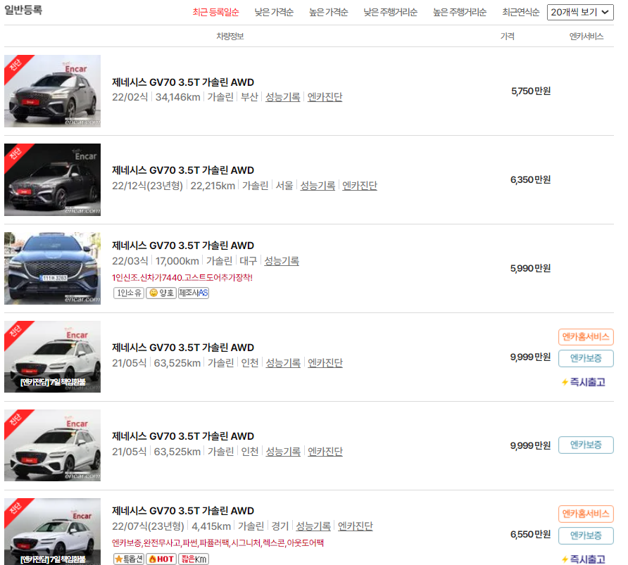 제네시스 GV70 가솔린 3.5터보 모델이 현대인증중고차에서는 9대가 등록되어 있고 엔카에는 44대가 등록되어 있습니다. 현대인증중고차 9대의 평균가격은 5,758만원, 엔카에서 최근 등록일순으로 10대의 평균가격은 5,862만원(9,999만원 제외)으로 오히려 엔카의 평균가격이 100만원 높습니다. 엔카의 전체 44대를 평균 내보면 달라질 수 있겠습니다.
