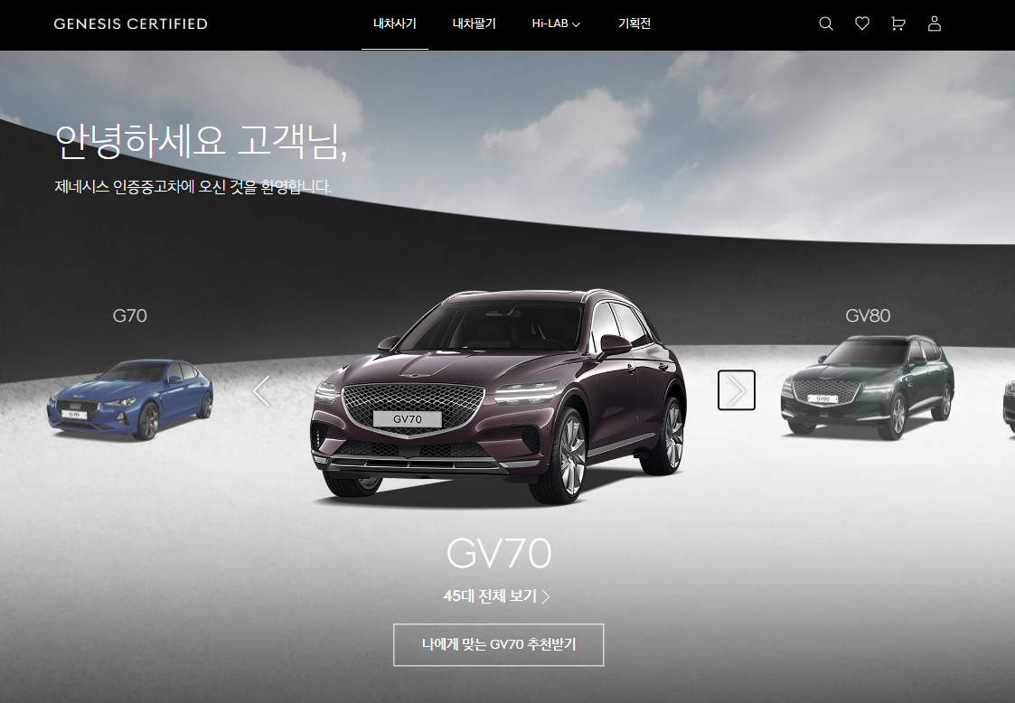 화면은 내차 팔기와 내차사기로 나눠집니다. 우리는 제네시스 GV70 중고차를 찾아보려 하고 있으니 오른쪽에 있는 GV70을 클릭하여 제네시스 인증 중고차로 이동합니다.