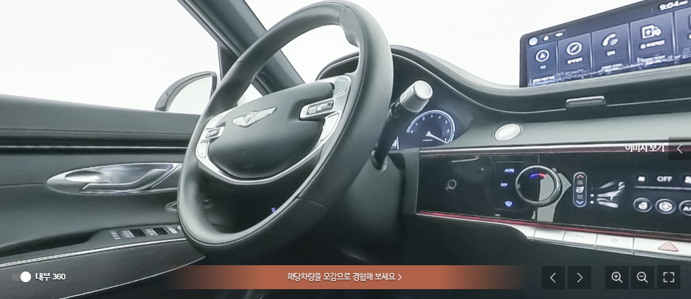 내/외부를 360도로 돌려가면서 확인할 수 있는 화면입니다. 마우스를 이용하여 내/외부를 자세히 돌려볼 수 있습니다. 모든 이미지의 퀄리티가 높으며 거의 같은 구도로 모든 차량을 찍기 때문에 비교해 보기가 용이합니다. 이미지의 퀄리티는 타 중고거래사이트와 비교해 높은 것 같습니다.
