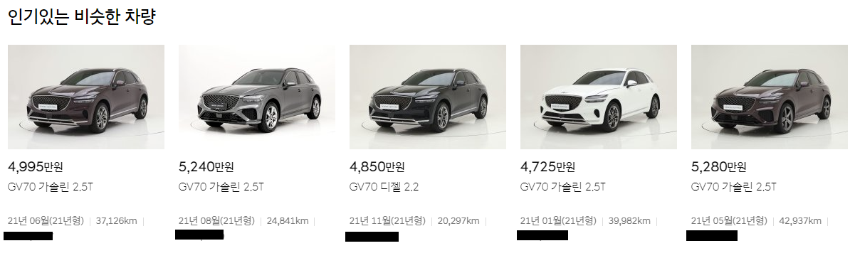 화면의 아랫부분에는 현대인증중고차에 등록되어 있는 인기 있는 비슷한 차량이 보입니다.
