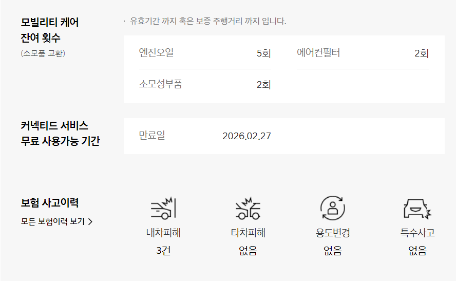보험 사고이력도 확인 가능합니다. 소모품 교환을 위한 모빌리티 케어 잔여 횟수도 표출됩니다.