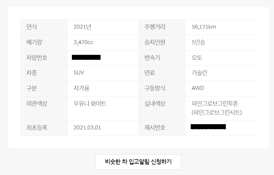 차량의 기본정보입니다. 비슷한 차가 입고될 경우 알림이 오도록 신청할 수 있습니다. 물론 로그인이 필요합니다.