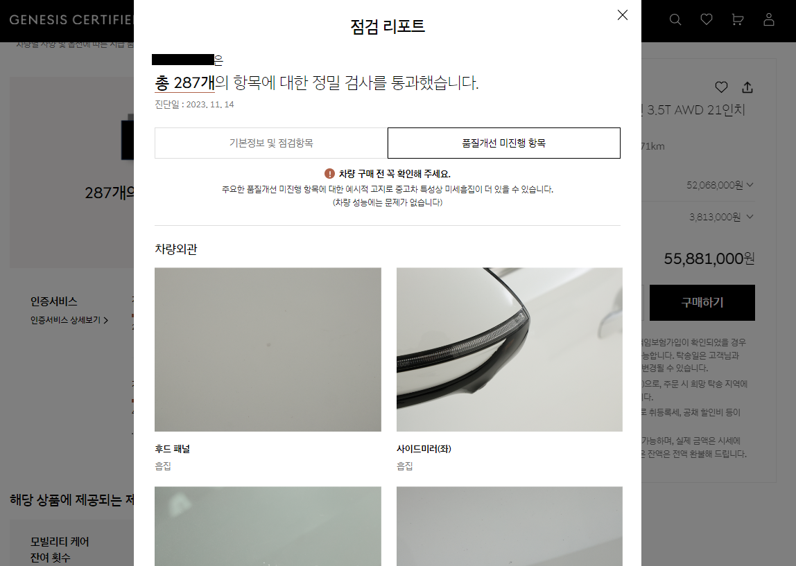 점검리포트 팝업에서 상세한 내용을 이미지로 제공하고 있습니다. 품질개선 미진행 항목에서는 미세한 흠집까지 고화질 이미지로 확인할 수 있습니다. 흠집이나 요철 등을 타 중고거래사이트가 이 정도로 공개하고 있지는 않을 듯합니다.