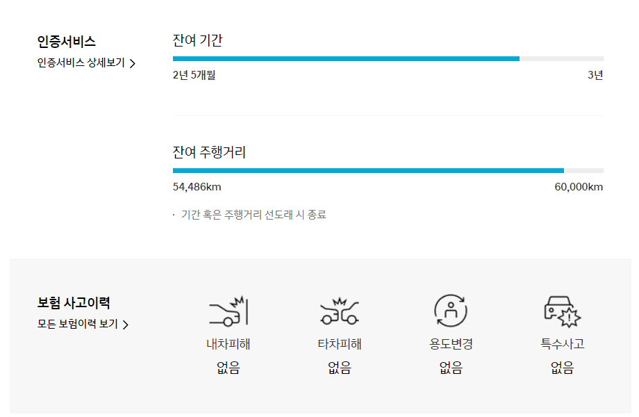 보험 사고이력도 확인 가능합니다. 소모품 교환을 위한 모빌리티 케어 잔여 횟수도 표출됩니다.