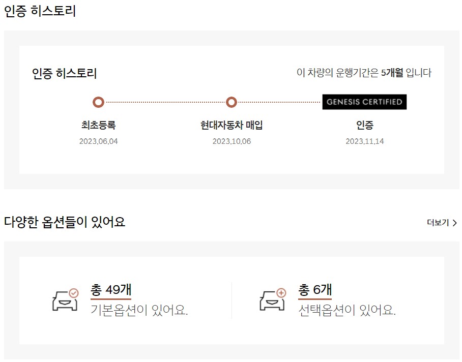 인증 히스토리에서는 신차출고일과 현대자동차의 매입일, 성능점검일, 인증일이 표출됩니다. 아래의 옵션확인 부분에서 더보기를 클릭하면 옵션의 상세내용을 확인할 수 있습니다.
