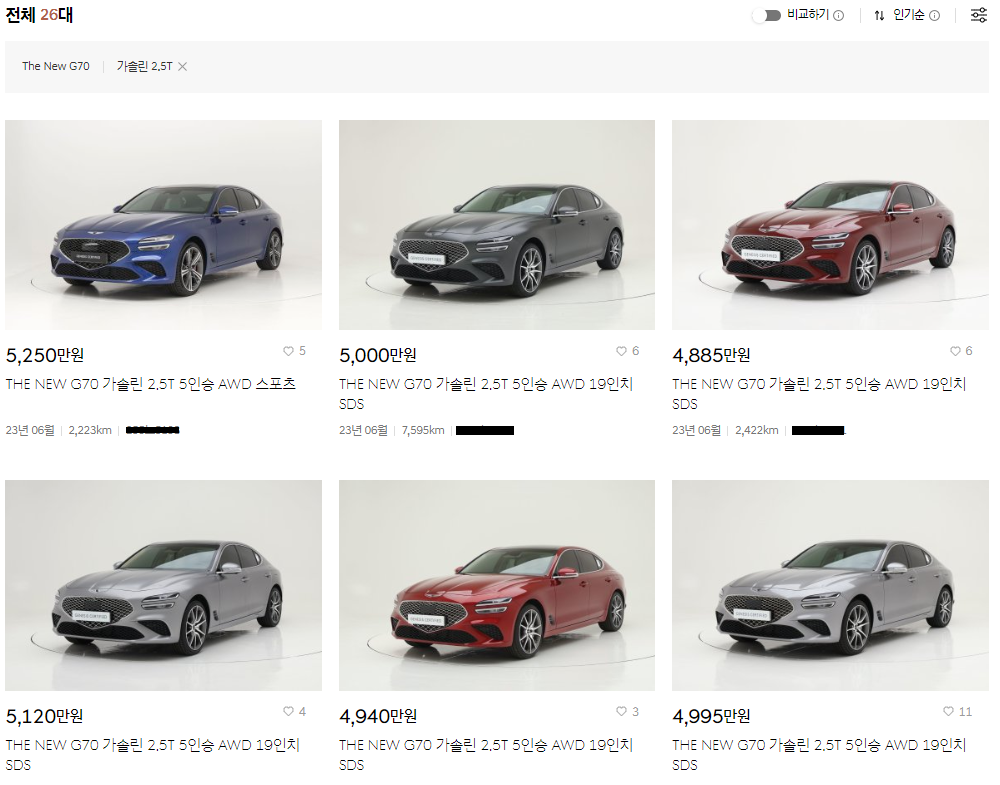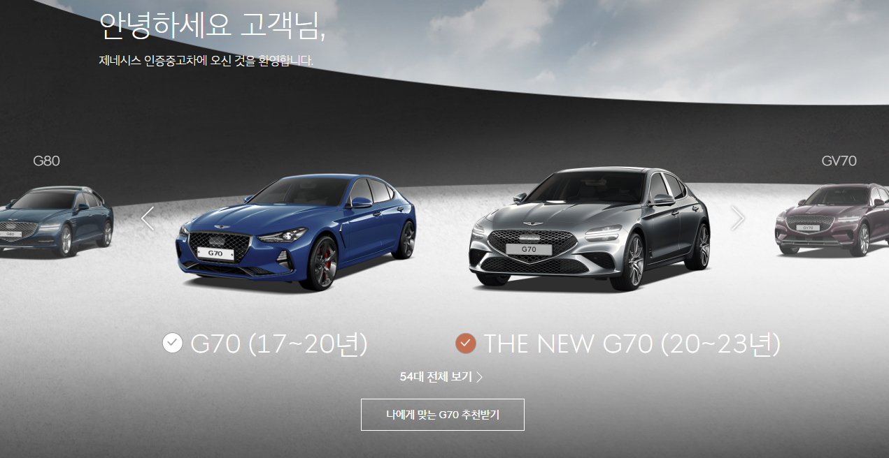 G80,G70,GV70,GV80,G90 등 제네시스의 모델들을 좌우로 움직이며 선택할 수 있습니다. 제네시스 G70은 17년부터 판매된 모델과 20년도에 출시된 The New G70이 있습니다. 글작성 시점(2023년 12월 16일)을 기준으로 The New G70이 54대가 등록되어 있는 것을 확인할 수 있습니다. '54대 전체 보기'를 클릭하고 모델 선택에서 G70 가솔린 2.5터보를 필터링하면 26대의 차량이 검색됩니다.