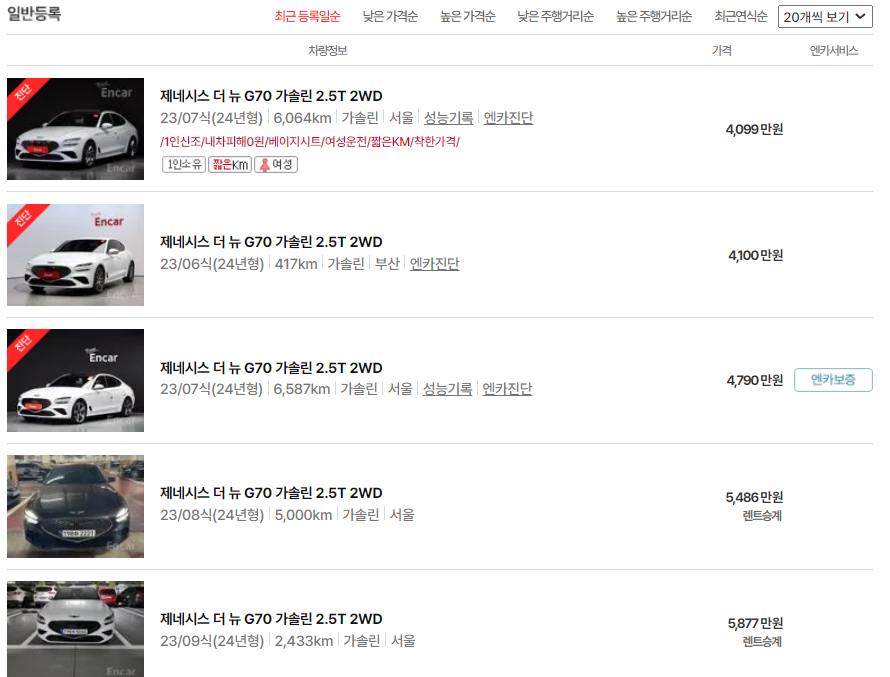 제네시스 G70 가솔린 2.5터보 모델이 현대인증중고차에 등록된 26대중 상단의 10대 평균가격은 5,068만원, 엔카에서 검색한 G70 가솔린 2.5터보 모델 5대의 가격평균은 4,870만원으로 거의 200만원 정도 차이가 발생하고 있습니다.