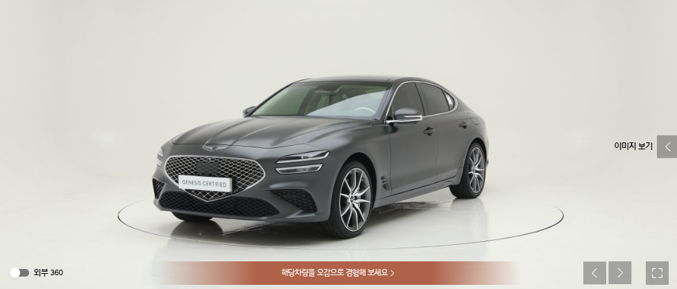 내/외부를 360도 돌려가면서 확인할 수 있는 화면입니다. 마우스를 이용하여 내/외부를 자세히 돌려볼 수 있습니다. 모든 이미지의 퀄리티가 높으며 거의 같은 구도로 모든 차량을 찍기 때문에 차량을 비교해 보기가 용이합니다. 이미지의 퀄리티는 타 중고거래사이트와 비교해 높은 것 같습니다.