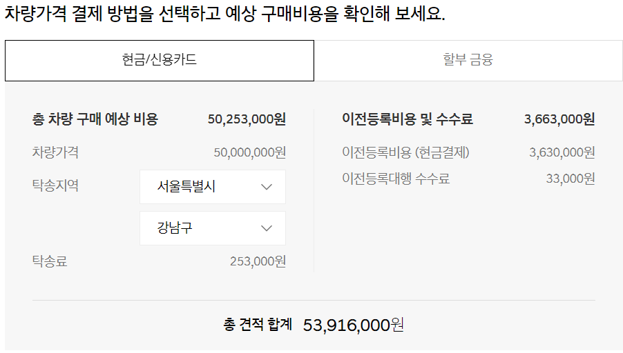 구매 예상 비용과 이전등록비 및 수수료 등을 합한 총 견적합계를 보여줍니다. 이 차량은 총 견적 합계가 53,916,000원으로 나타납니다.