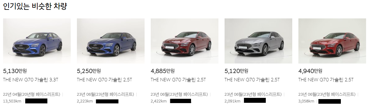 화면의 아랫부분에는 현대인증중고차에 등록되어 있는 인기 있는 비슷한 차량이 보입니다.