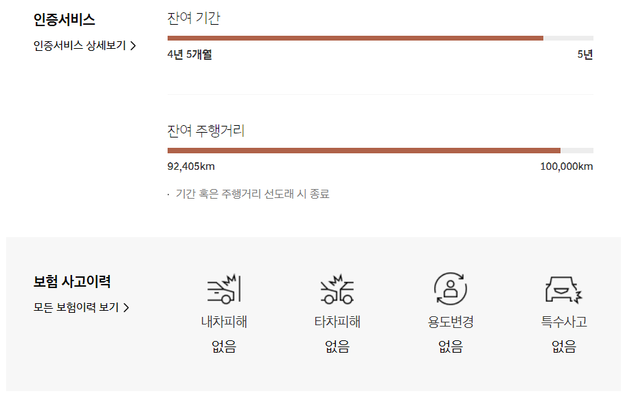 보험 사고이력도 확인 가능합니다. 다행히 이 차량은 보험이력이 없습니다. 소모품 교환을 위한 모빌리티 케어 잔여 횟수도 표출됩니다.