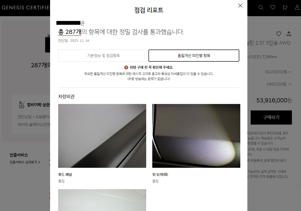 점검리포트 팝업에서 상세한 내용을 이미지로 제공하고 있습니다. 품질개선 미진행 항목에서는 미세한 흠집까지 고화질 이미지로 확인할 수 있습니다. 흠집이나 요철 등을 타 중고거래사이트가 이 정도로 공개하고 있지는 않을 듯합니다.