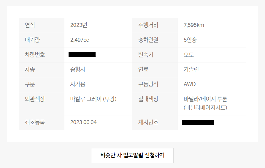 차량의 기본정보입니다. 비슷한 차가 입고될 경우 알림이 오도록 신청할 수 있습니다. 물론 로그인이 필요합니다.