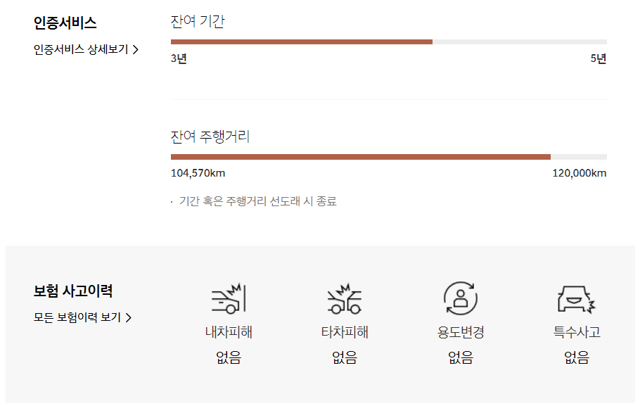 보험 사고이력도 확인 가능합니다. 소모품 교환을 위한 모빌리티 케어 잔여 횟수도 표출됩니다. 다행히 이차량은 보험 사고이력이 없는 차량입니다.