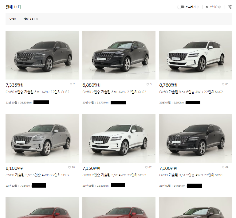 제네시스 GV80 가솔린 3.5터보 AWD 모델이 현대인증중고차에는 11대가 등록되어 있고 엔카에는 200대나 등록되어 있다. 역시 국내 최대의 중고차 거래 사이트인 엔카의 등록대수는 갖 론칭한 현대인증중고차와 비교가 불가하다. 현대인증중고차 11대의 평균가격은 7,535만원, 엔카에서 최근 등록일순으로 10대의 평균가격은 6,336만원으로 1,200만원 정도의 차이가 있다. 물론 이런 방식의 가격비교는 모수 자체가 매우 작고 정확하지도 않을 수 있지만 현대인증중고차에는 여러 가지 이유로 가격이 저렴한 차량은 올라가지 않는다는 것을 알 수 있기도 하다.