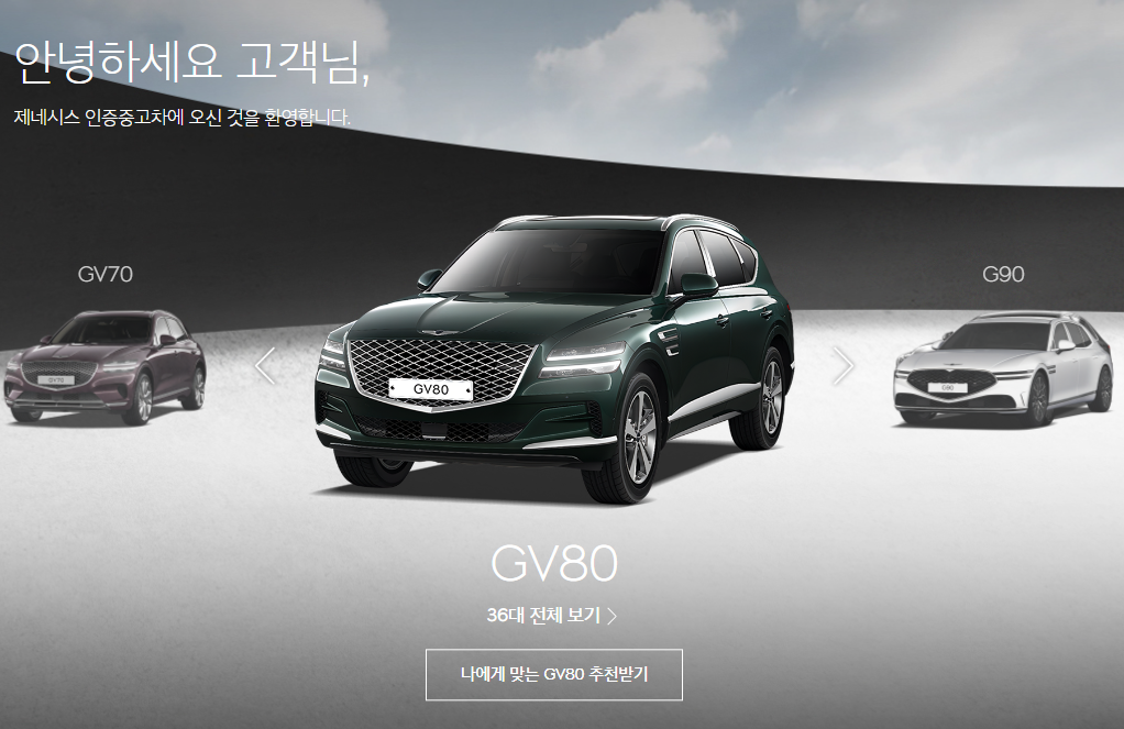 화면은 내차팔기와 내차사기로 나눠집니다. 우리는 제네시스 GV80 중고차를 찾아보려 하고 있으니 오른쪽에 있는 GV70을 클릭하여 제네시스 인증 중고차로 이동합니다.