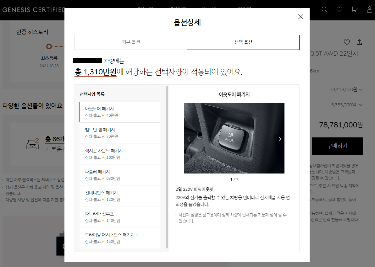 기본옵션과 선택옵션에 대해 상세하게 확인할 수 있습니다. 선택사양 목록에서는 신차 출고 시 해당 옵션의 가격까지 나옵니다.