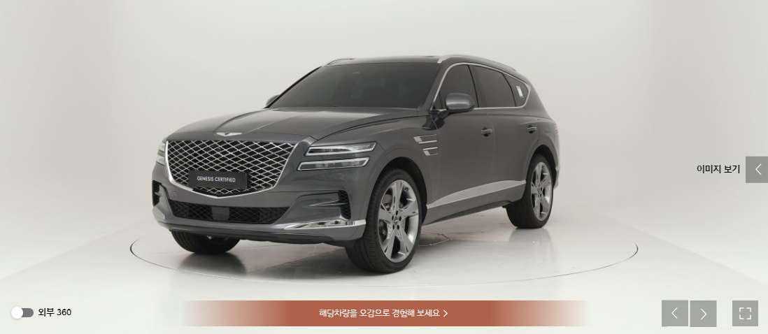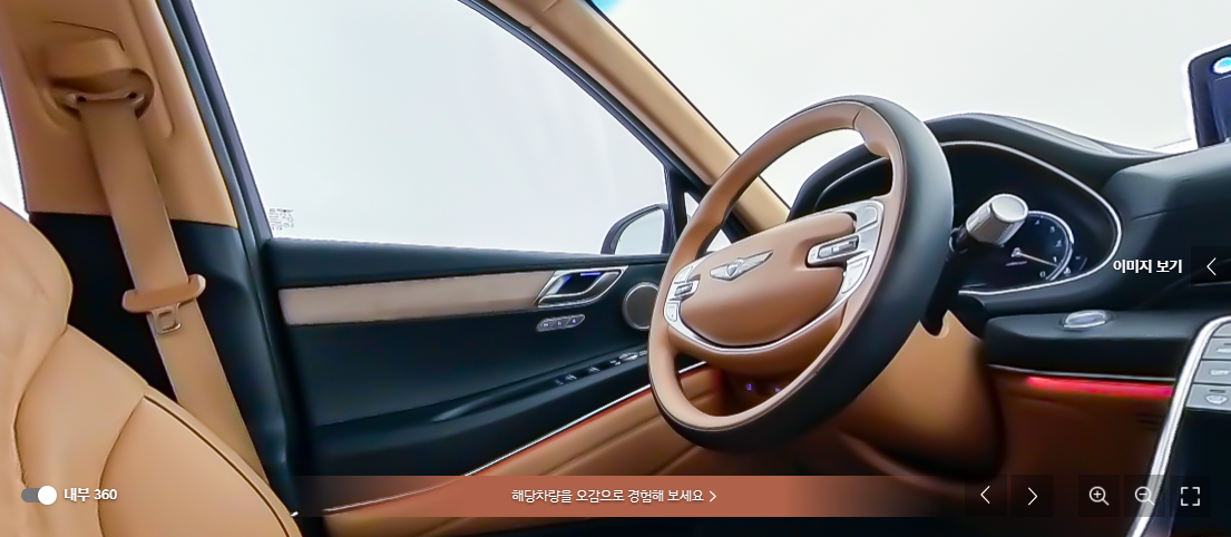 내/외부를 360도로 돌려가면서 확인할 수 있는 화면입니다. 마우스를 이용하여 내/외부를 자세히 돌려볼 수 있습니다. 모든 이미지의 퀄리티가 높으며 거의 같은 구도로 모든 차량을 찍기 때문에 비교해 보기가 매우 용이합니다. 이미지의 퀄리티는 타 중고거래사이트와 비교해 높은 것 같습니다.