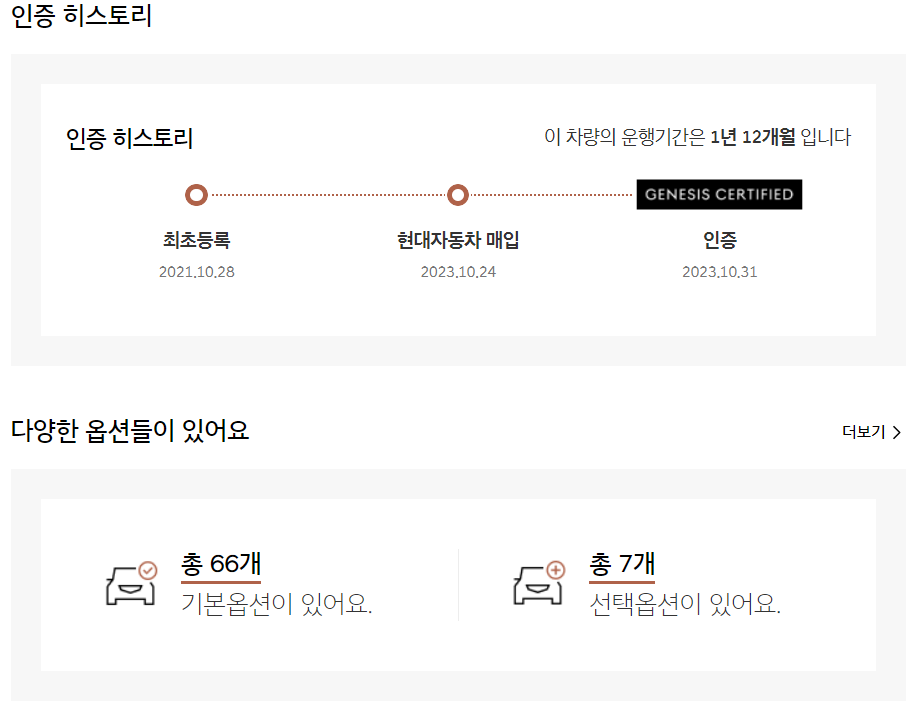 인증 히스토리에서는 신차출고일과 현대자동차의 매입일, 성능점검일, 인증일이 표출됩니다. 아래의 옵션확인 부분에서 더보기를 클릭하면 옵션의 상세내용을 확인할 수 있습니다.
