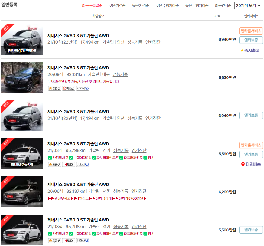 현대인증중고차 제네시스 GV80 중고차 VS 엔카 가격비교