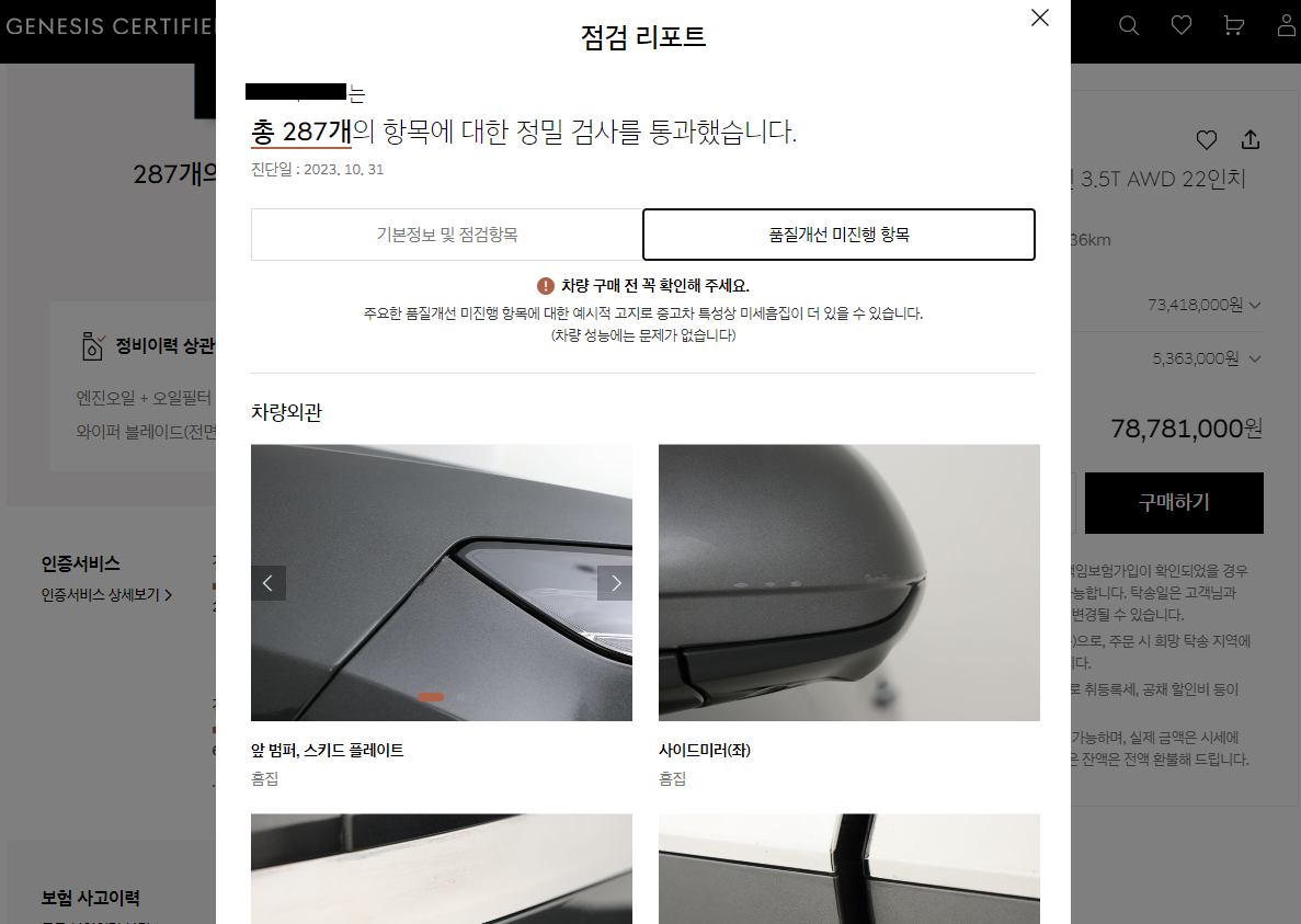점검리포트 팝업에서 상세한 내용을 이미지로 제공하고 있습니다. 품질개선 미진행 항목에서는 미세한 흠집까지 고화질 이미지로 확인할 수 있습니다. 흠집이나 요철 등을 타 중고거래사이트가 이 정도로 공개하고 있지는 않을 듯합니다.