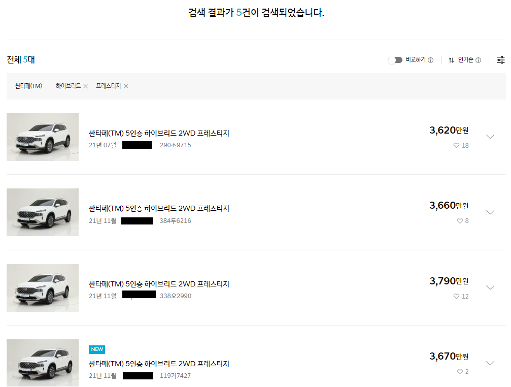 싼타페 TM 하이브리드 프레스티지가 현대인증중고차에서는 5대가 등록되어 있고 엔카에는 50대가 등록되어 있습니다.역시 등록대수는 엔카입니다. 현대인증중고차 5대의 평균가격은 3,630만원, 엔카에서 최근 등록일순으로 10대의 평균가격은 3,422만원으로 현대인증중고차가 200만원 정도 높습니다.