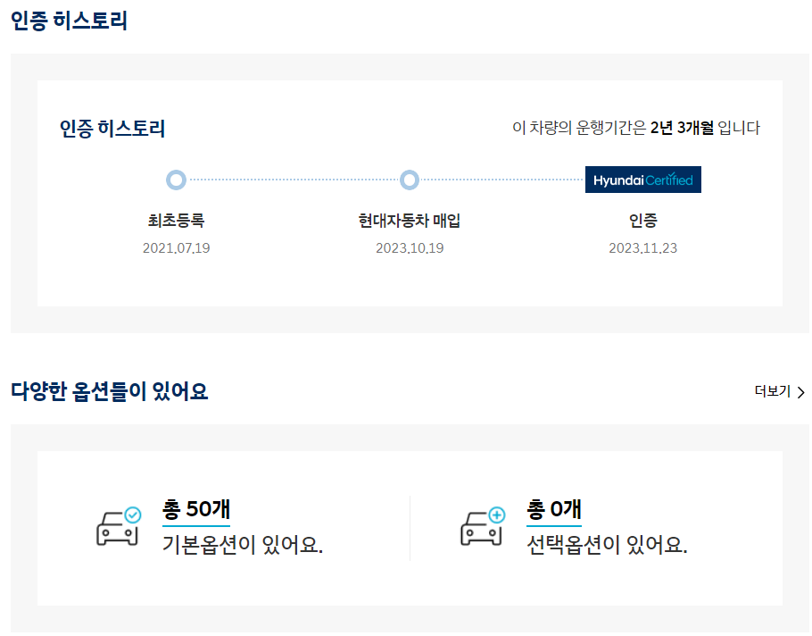인증 히스토리에서는 신차출고일과 현대자동차의 매입일, 성능점검일, 인증일이 표출됩니다. 아래의 옵션확인 부분에서 더보기를 클릭하면 옵션의 상세내용을 확인할 수 있습니다.