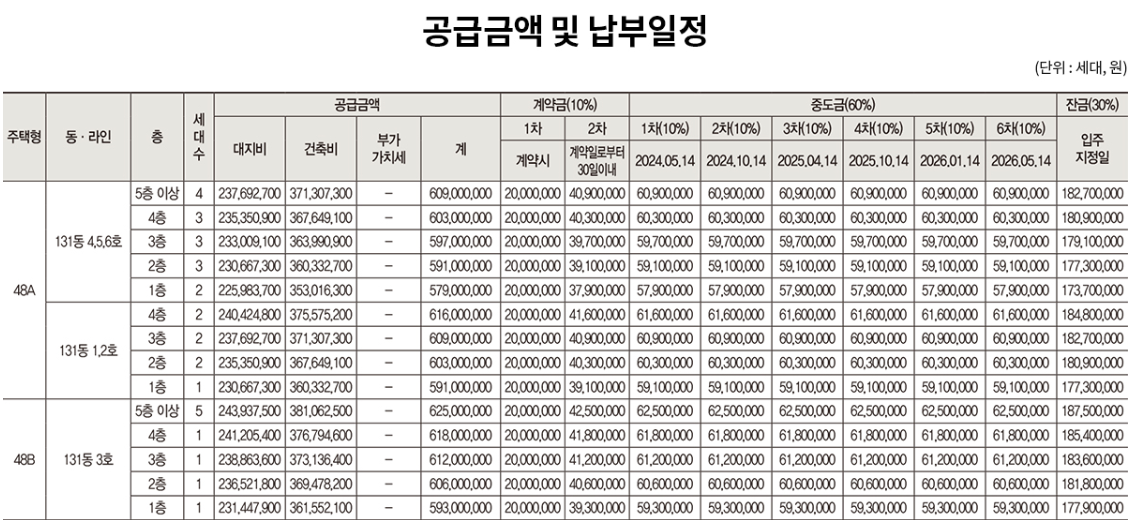 계약금 10%, 중도금 60%, 잔금 20%으로 납부일정이 구성됩니다. 분양가는 평당 약 2,600~3,100만원 정도로 가장 세대수가 많은 34평형(84A, 84B)이 8.5억에서 8.99억에 이릅니다. 분양가가 비싸다는 평이 있습니다만 다른 단지도 분양가가 비싸다는 말은 있었지만 경쟁률은 높았었습니다. 항상 그랬던 것 같습니다. 주변시세를 확인해 보면 9억 ~ 10억의 물건들이 나와있으므로 시세대로 나왔다고 평가할 수도 있습니다. 하지만 경재상황과 부동산상황을 볼 때 어떻게 될지는 지켜봐야 합니다. 구축과 시세가 비슷하다면 2026년도에 입주하는 팰루시드의 경쟁력이 있다고도 할 수 있습니다.
