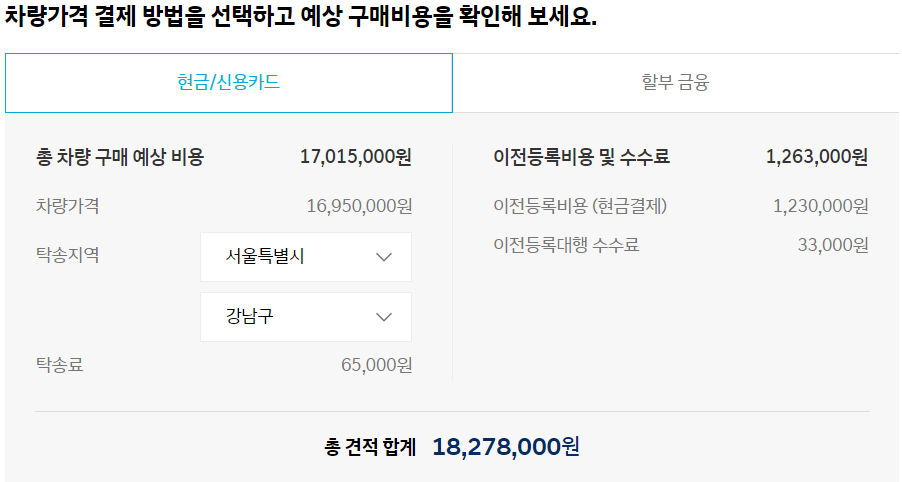 구매 예상 비용과 이전등록비 및 수수료 등을 합한 총 견적 합계를 보여줍니다. 이 차량은 총 견적 합계가 18,278,000원으로 나타납니다.